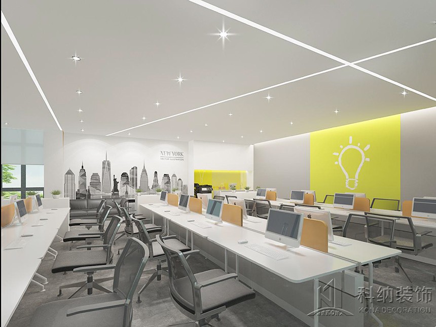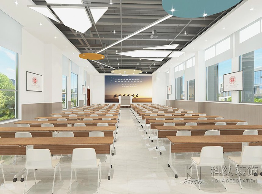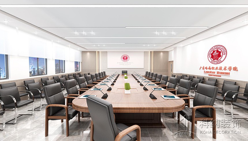 設計理念:該案例是嶺南學院清遠校區行政辦公樓設計裝修項目,為了使行政樓更好地作為服務和辦公場所,設計師根據使用需求將一層設計為多功能綜合服務大廳;二層為校企合作基地,對外辦公;三層作為行政職能辦公室;四層為校領導、核心職能部門辦公室,對內辦公;五層作為會議室和檔案室,用于內部使用。這樣的規劃設計合理,各區域既聯系又互不影響,很好地將校內外人員分流,最大程度地利用全部空間。天花圓形造型與線條組合,構造出“宇宙星空軌跡”,飛機造型吊燈寓意學生以嶺南學院為起點,學有所成,飛向屬于他們各自的領域。墻面以護墻板裝飾,既起到保護墻體的作用,又與整體風格相呼應。
