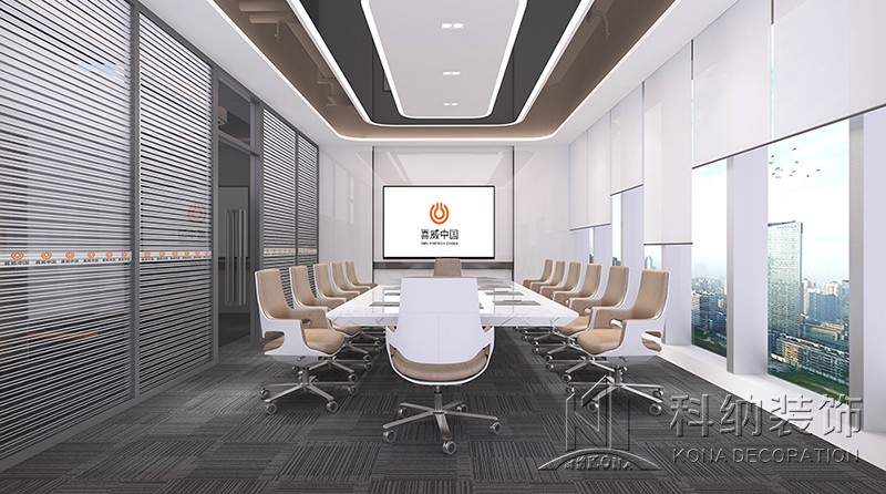 中會議室墻面配以灰色乳膠漆,簡單的圖案豐富空間的層次感,使整個辦公空間色調干凈高雅;白色軟膜天花相結合的造型吊頂,形成快捷明亮舒適的室內空間,這也是辦公室設計的功能要求所決定的。