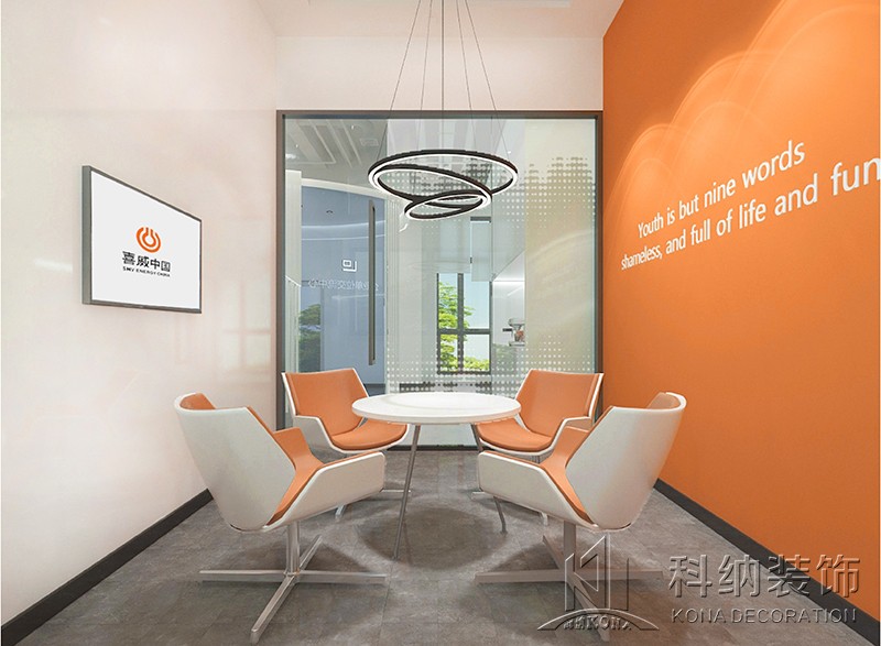 接待室色彩學的和諧主流便是 一動一靜,一冷一暖。在簡約的白空間里融入激情的橙,時尚美氤氳而生。