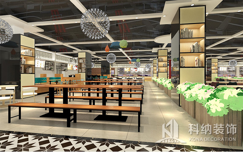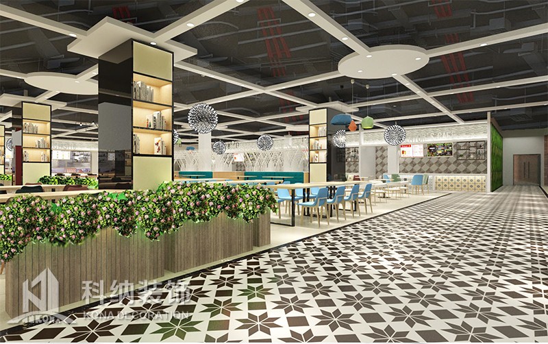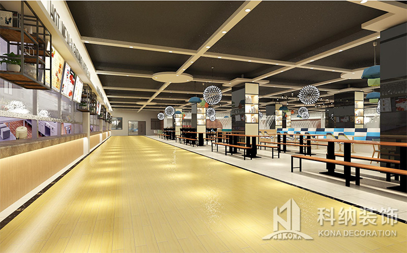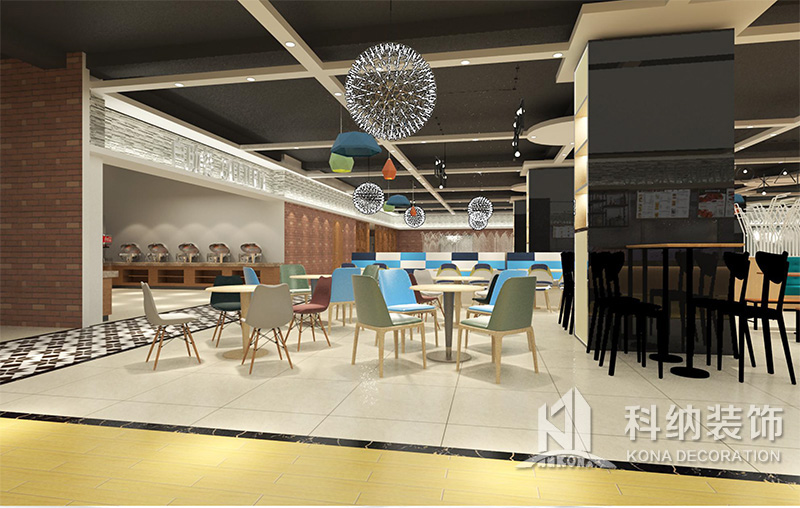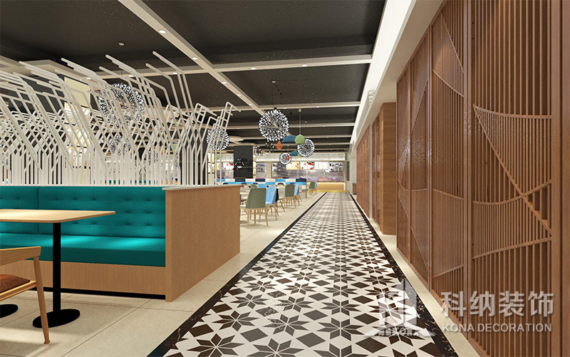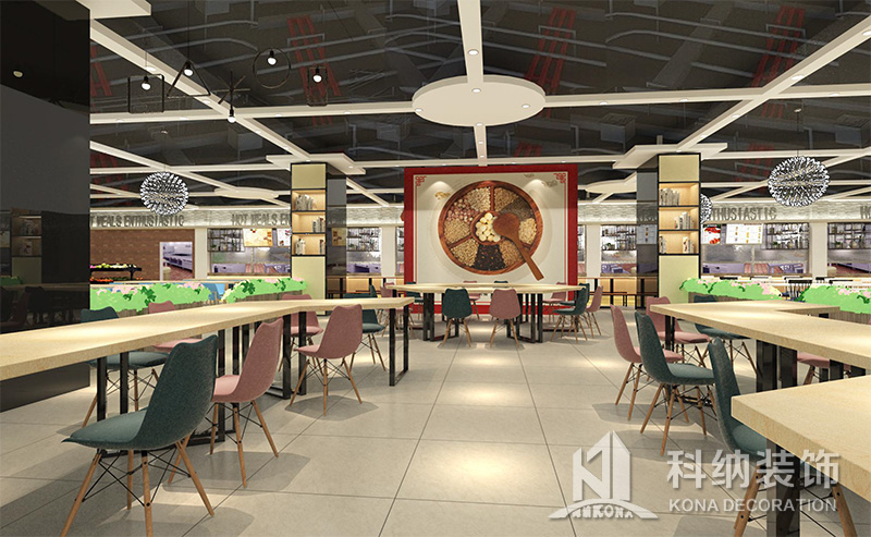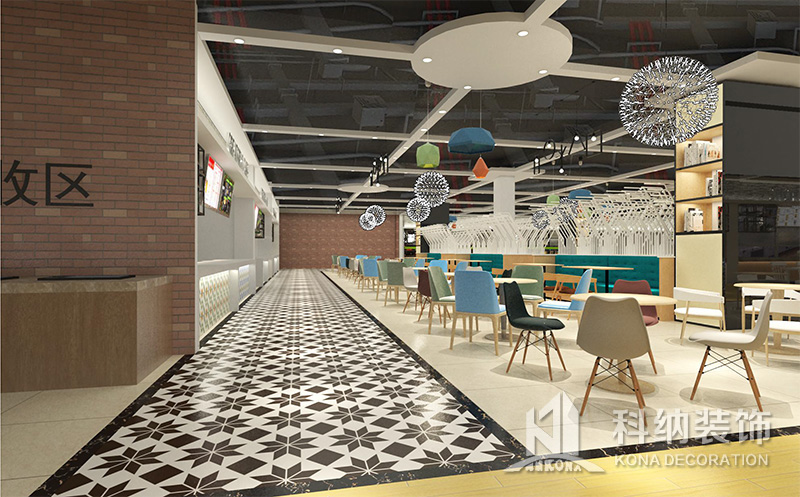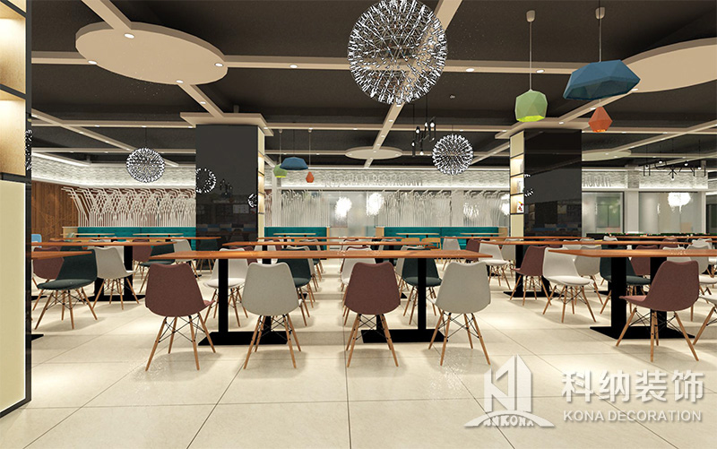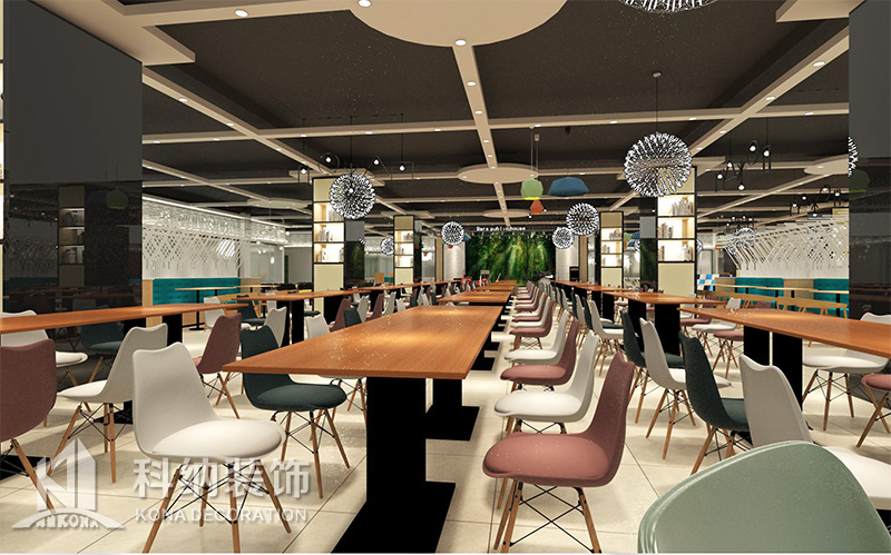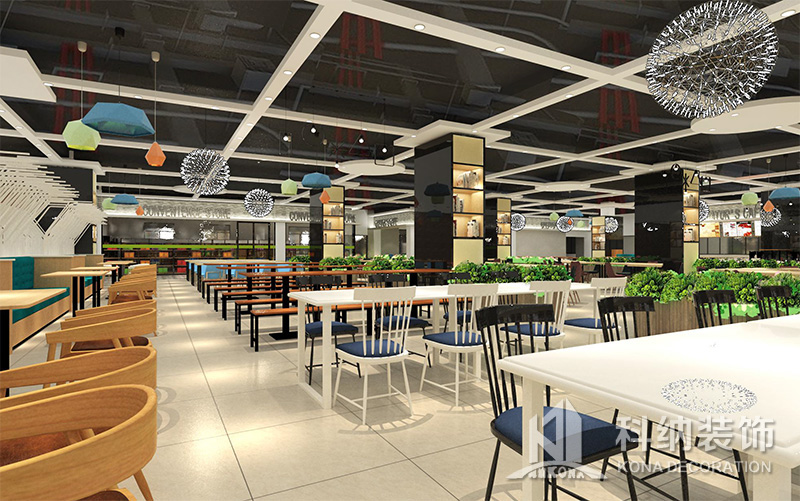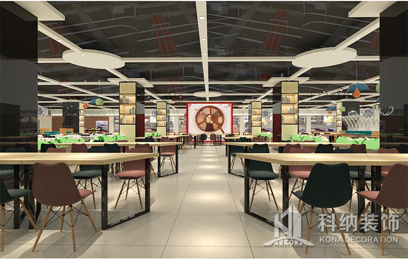 設計理念:該項目為嶺南職業學院清遠校區休閑餐廳,一樓可同時容納723人數,二樓513人。設置有廚房、就餐區、品牌門店、多功能活動大廳、休閑區、自助餐區、接待包房等多個區域。設計師通過可移動屏風隔斷墻實現包廂可變性,一個大包廂或2-3個小包廂之間的變換,可根據用餐人數決定空間的大小。餐廳不僅僅是用餐的功能,更是一個社交與體驗的場所,設計師在空間中設定了多種用餐場景,同時通過區域的劃分搭配不同座位的組合方式,從2人位到12人位,滿足了不同場景下的用餐需求。中心區域利用綠植劃分出來,使空間彼此分隔又能保持空間的通透。視線透過折線陣列的間隙,讓隔斷若實若虛。包房內是傳統的中式宴請圓桌,和依舊灰色調為主的空間氛圍。墻面的裝飾畫,沒有濃墨重彩的痕跡,只是寥寥幾筆,將所有的刻意掩埋。