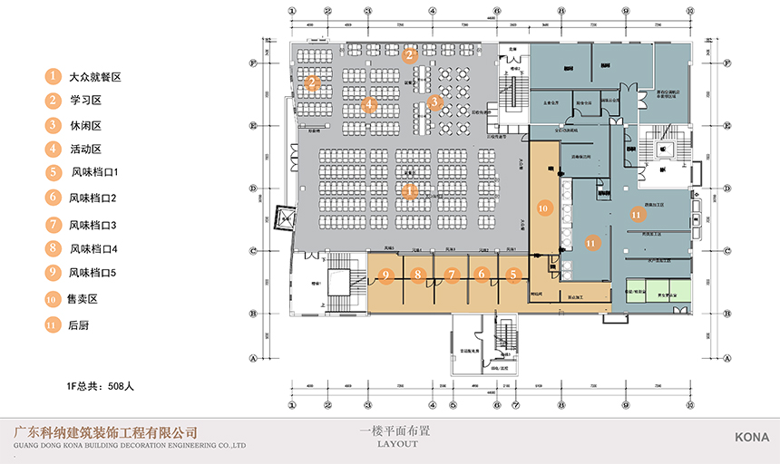 設計理念:休閑區的設計應用鮮艷色彩,課后的學生來到體驗休閑愜意讓人心曠神怡。學術交流區應用了可組合的桌椅做搭配,造型吊燈使整個空間顯得生動有趣考慮到多人活動,方便學生自由組合。團體就餐區橫向舒展的開放式桌椅布局給予一層空間通透且自由的氛圍,由此顯露出交互的趣味性與工作的靈活性。大眾就餐區的設計以暖色調為主,以色彩鮮艷的桌椅做點綴,為空間增加活躍氣息。