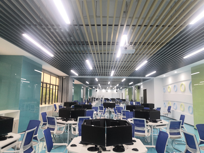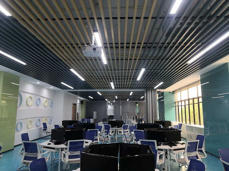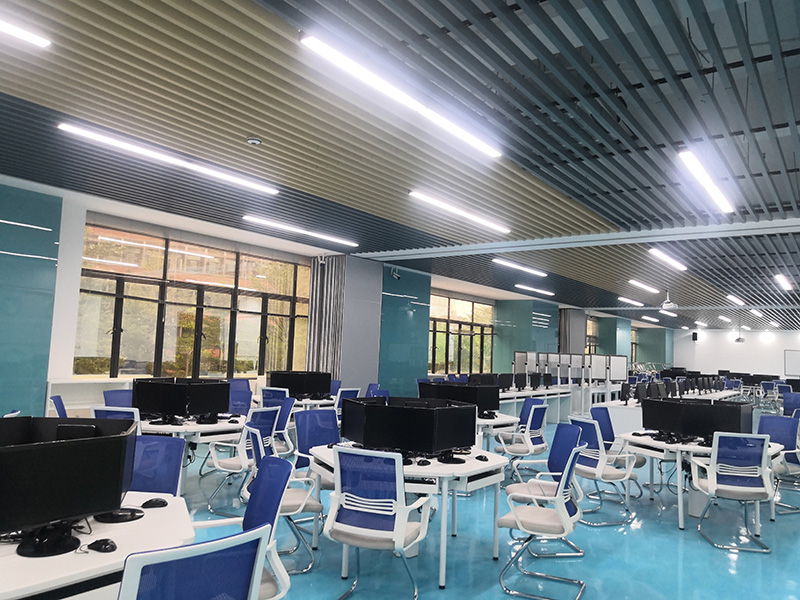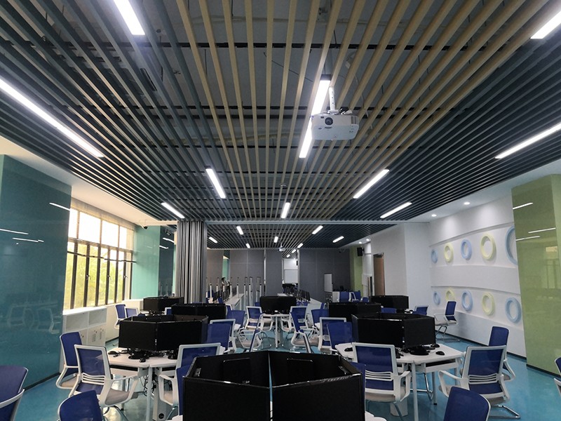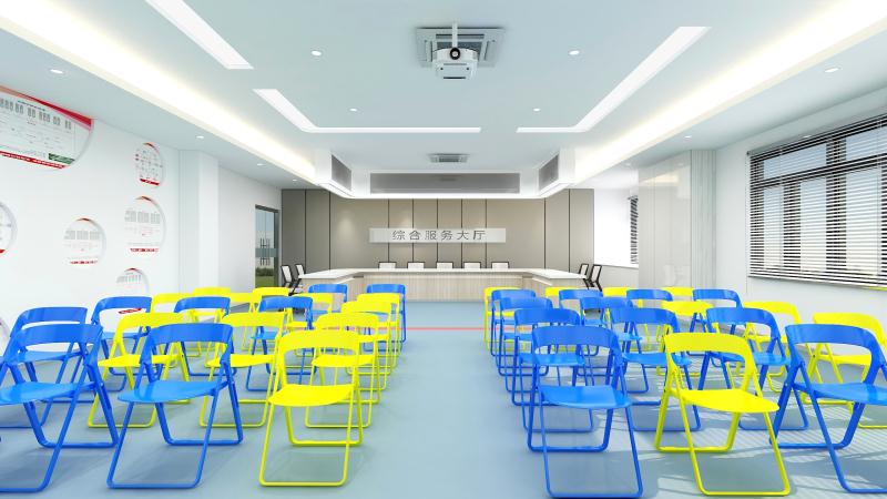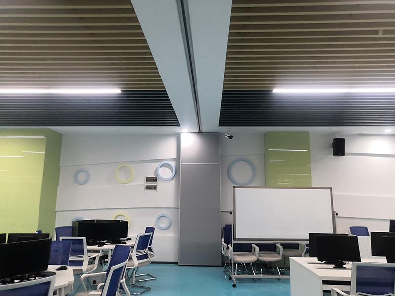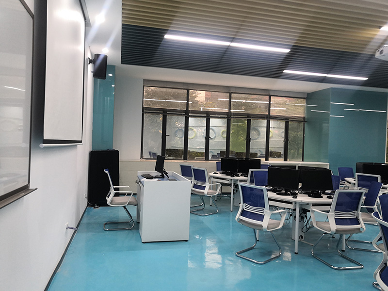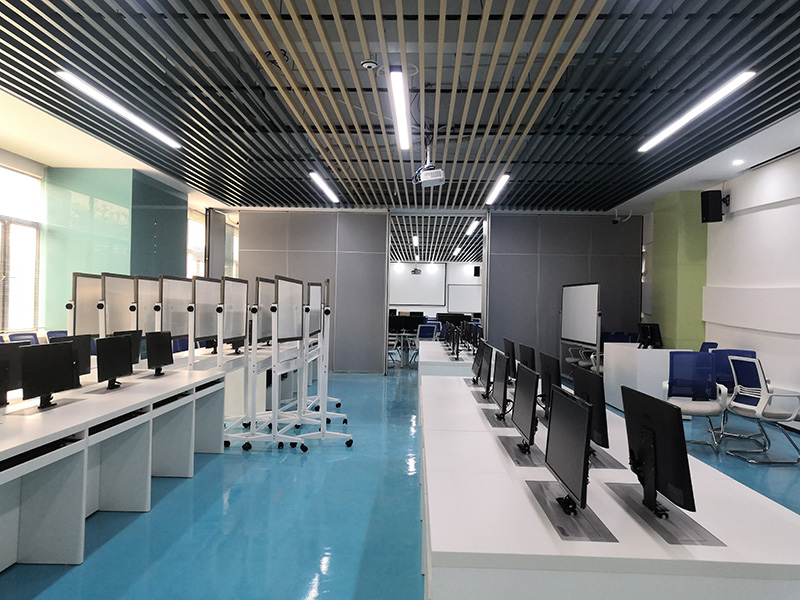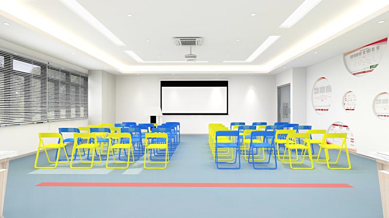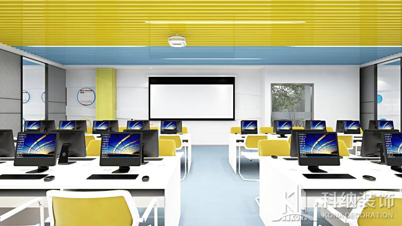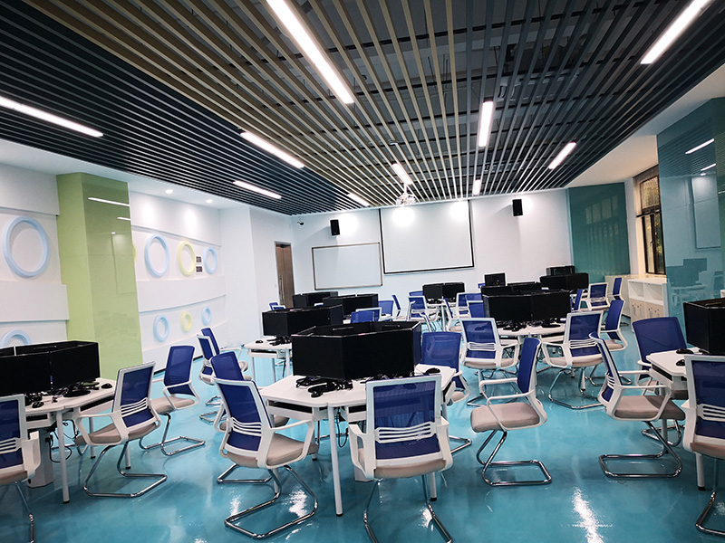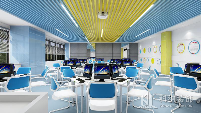 設計理念:清遠校區經營虛擬仿真中心裝修工程,教室的色調整體把控在藍色系上,寬敞的空間一眼望去變讓人感到十分的舒適,簡單明了,色彩上溫暖的淺色系與白色搭配也顯得非常的干凈,幾個不同教室用可移動屏風隔斷,可變換多種風格。