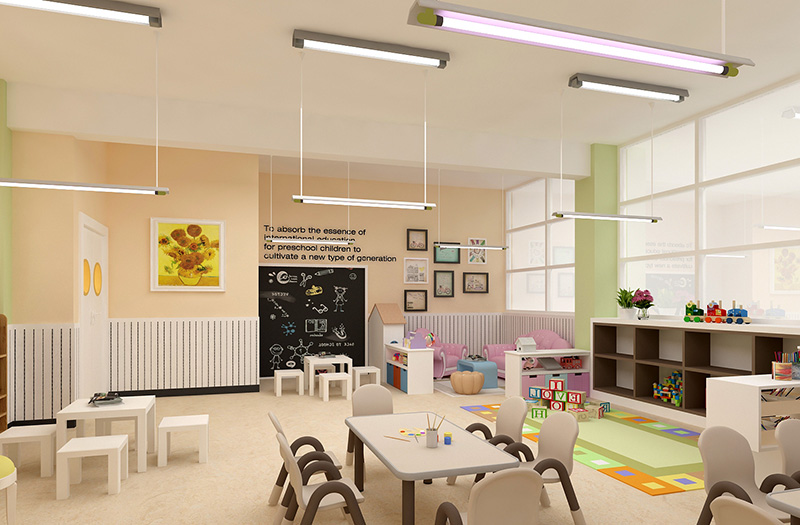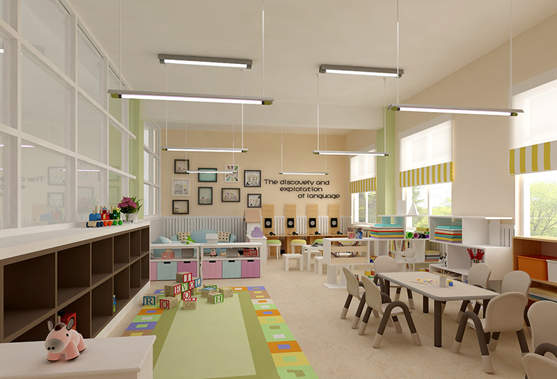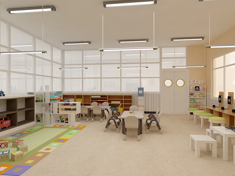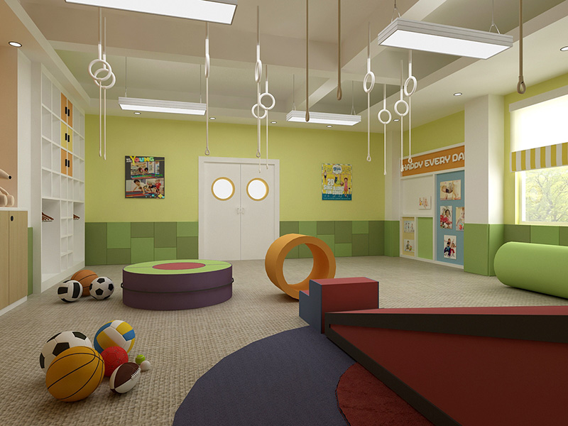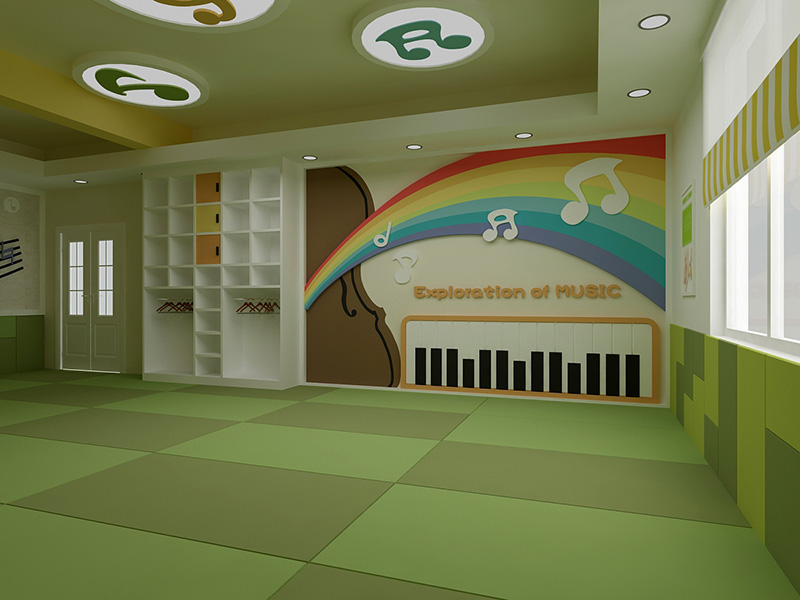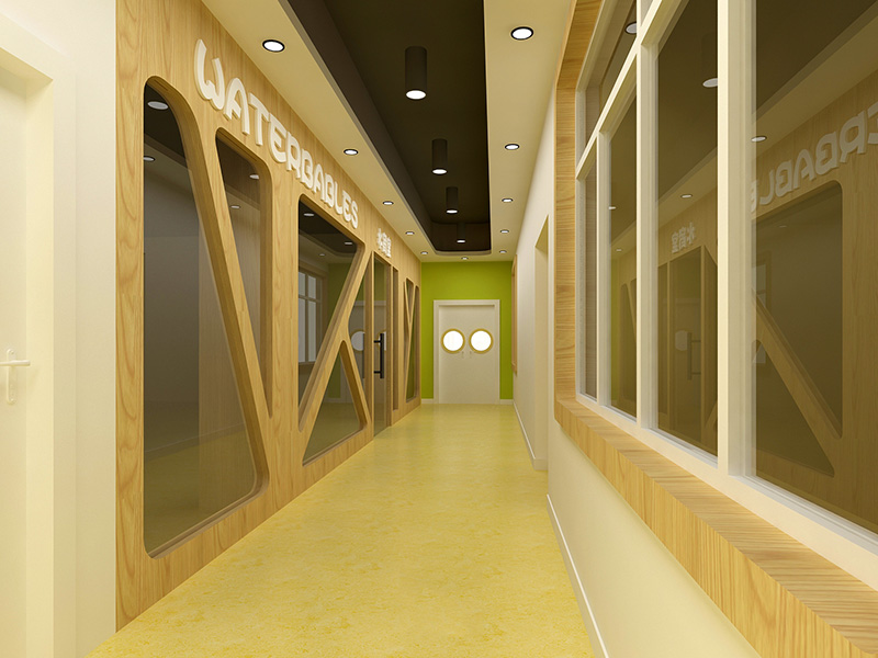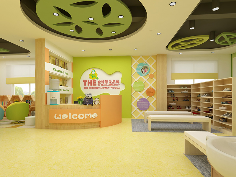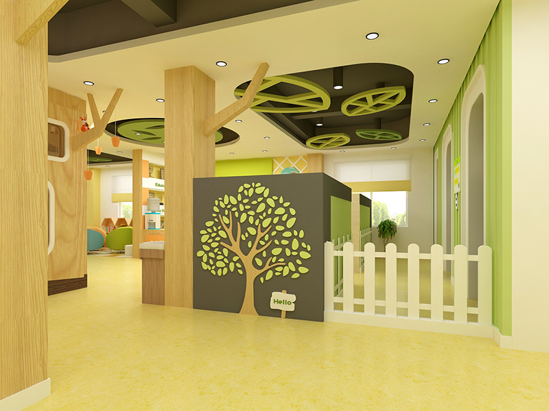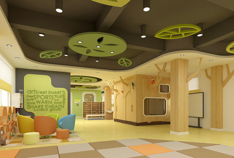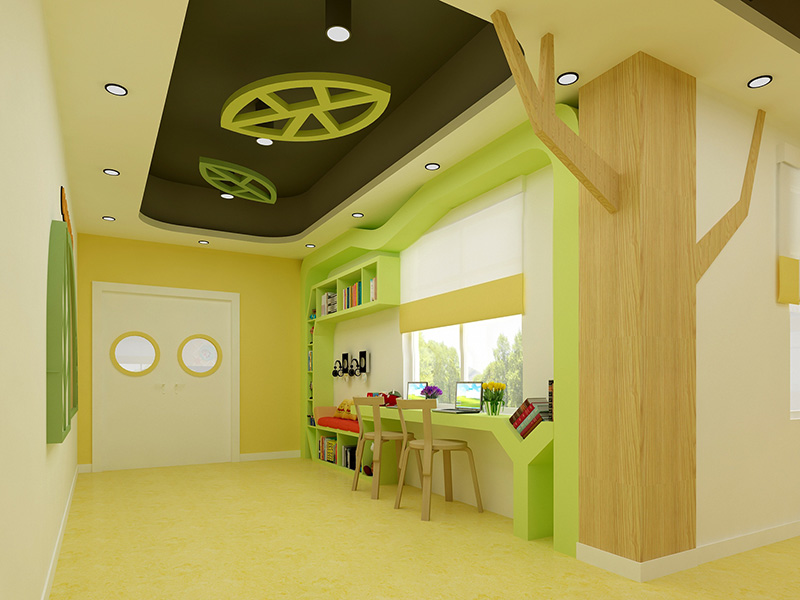 設(shè)計理念:本幼兒園設(shè)計案例基于兒童的心理及生理特點(diǎn),設(shè)計師利用了顏色來表達(dá)情感。以淺橙色,蘋果綠作為主題色,分別代表了可愛柔和的親切感,活力明快的健康成長,清爽積極的探索思考。再加入了原木色的家具及柜體,使得整個空間在光線的映襯下顯得柔和,自然。大面積使用了原木墻板及原木假梁,這種秩序和結(jié)構(gòu)的關(guān)系對幼小的孩子充滿了啟發(fā)性。